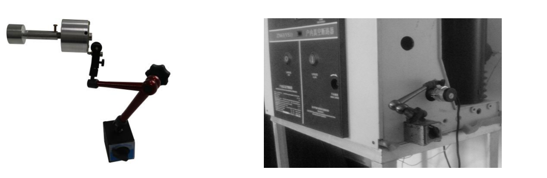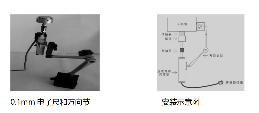 傳感器的直線拉桿用磁鐵吸附在開關的垂直導電桿(動觸頭)上,傳感器用萬向支架固定,在分閘狀態上時行安裝。安裝時電子尺必須和動觸頭垂直,先拉出15mm左右的長度,確保合分閘時傳感器不要應開關上下運動而拉壞。這類安裝方法主要是ZN28開關或者是沒有安裝底盤的ZN63(VSI)等動觸頭裸露出來的真空開關。